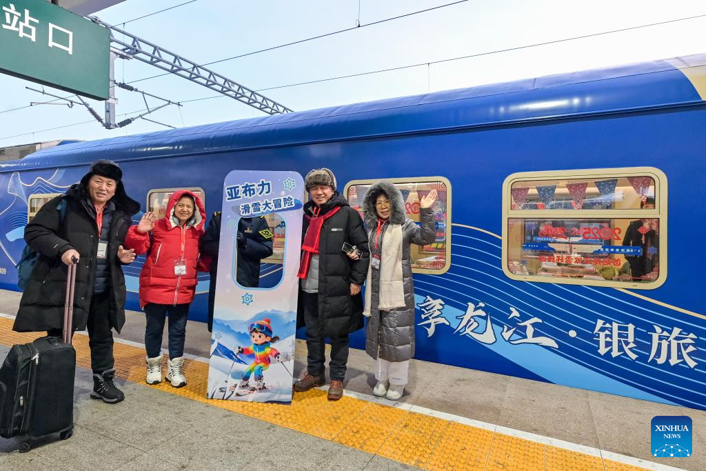 Tourists pose for photos with a tourism train at Harbin East Railway Station in Harbin, northeast China's Heilongjiang Province, Dec. 28, 2025. Train Y999/998, an ice-and-snow themed tourism loop train, started a six-day trip on Sunday. (Photo by Yuan Yong/Xinhua)