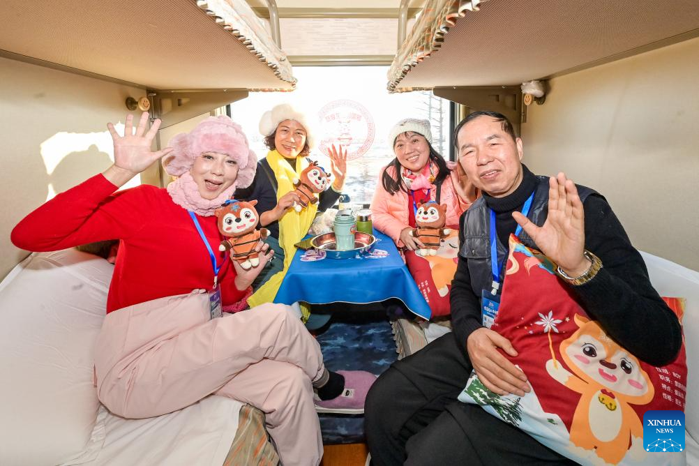Tourists experience local culture onboard a tourism train in northeast China's Heilongjiang Province, on Dec. 28, 2025. Train Y999/998, an ice-and-snow themed tourism loop train, started a six-day trip on Sunday. (Photo by Yuan Yong/Xinhua)