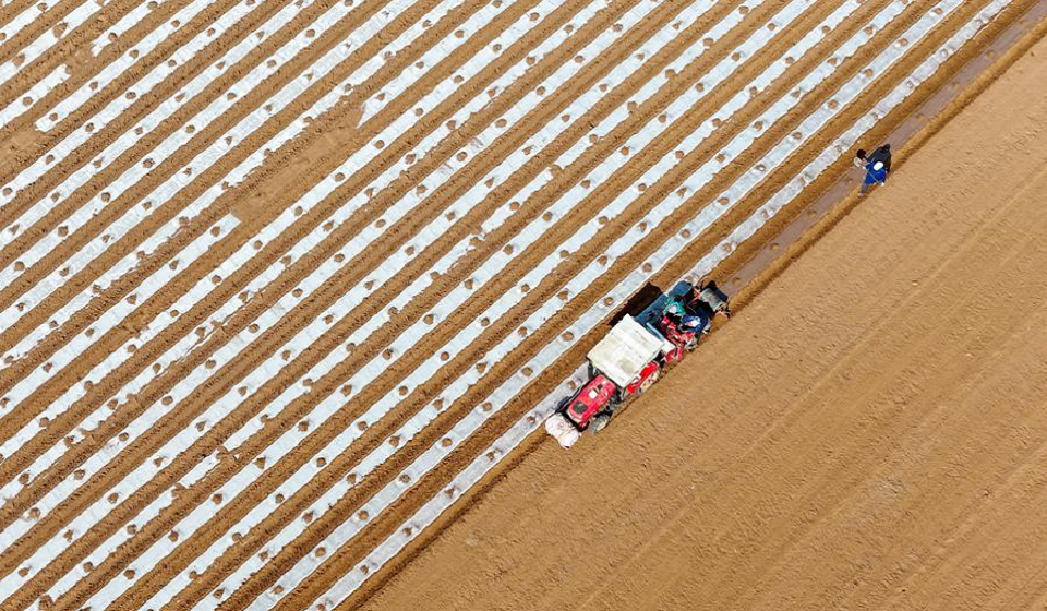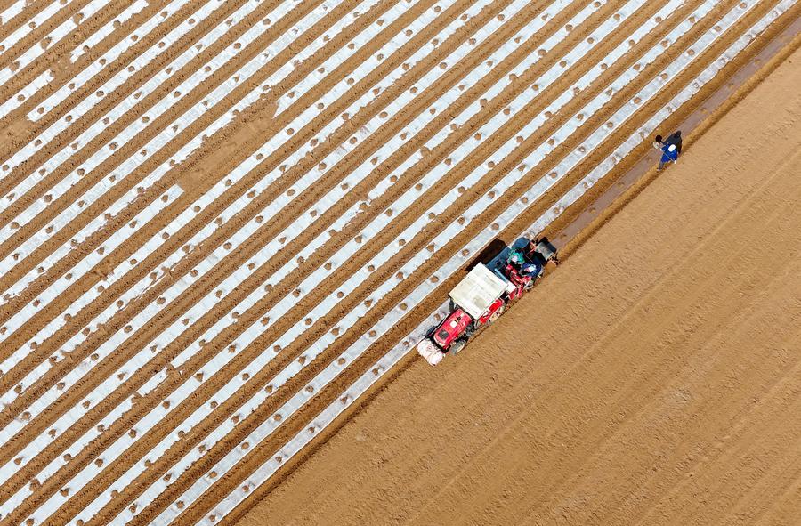A drone photo taken on March 14, 2025 shows a potato seeding machine loaded with Beidou navigation system working in a field in Liuwang Town, Qingdao City of east China's Shandong Province. (Photo by Zhang Jingang/Xinhua)