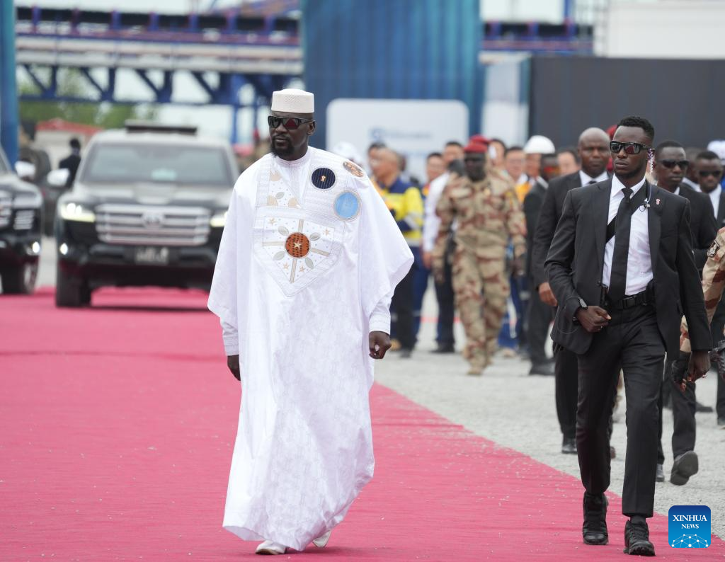 This photo taken on Nov. 11, 2025 shows Mamady Doumbouya (L) attending an official launch ceremony of the Simandou iron ore and infrastructure project held at the port of Morebaya, Forecariah Prefecture, Guinea. Guinea's transitional President Mamady Doumbouya won the presidential election held on Dec. 28, according to provisional results released Tuesday by the General Directorate of Elections. (Xinhua/Zhang Jian)