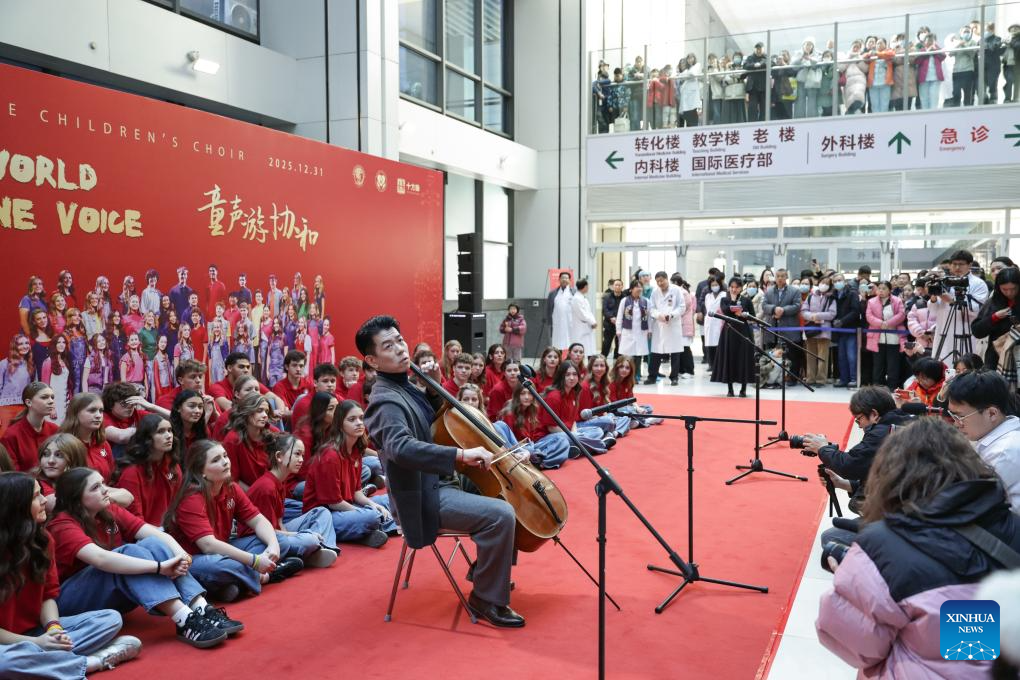 Feng Yao, the principal cellist of the Schleswig-Holstein Symphony Orchestra from Germany, performs at the Peking Union Medical College Hospital (PUMCH) in Beijing, capital of China, Dec. 31, 2025. Fifty-six young performers from One Voice Children's Choir along with invited musicians gave a performance at the hospital on Wednesday. (Xinhua/Zhang Yuwei)