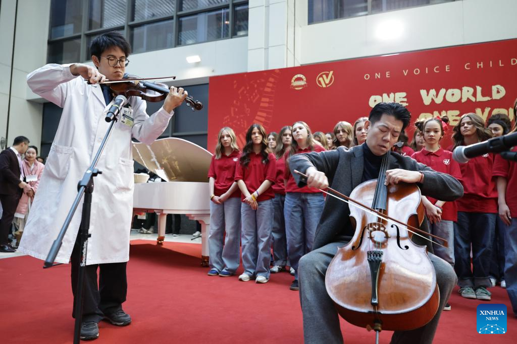 Ouyang Quanshi (L) from the Peking Union Medical College Hospital (PUMCH) and Feng Yao, the principal cellist of the Schleswig-Holstein Symphony Orchestra from Germany, perform at the PUMCH in Beijing, capital of China, Dec. 31, 2025. Fifty-six young performers from One Voice Children's Choir along with invited musicians gave a performance at the hospital on Wednesday. (Xinhua/Zhang Yuwei)