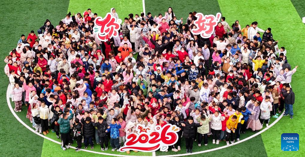 An aerial drone photo taken on Dec. 31, 2025 shows students posing for a group photo at a primary school in Huai'an, east China's Jiangsu Province. Various activities were held across China to celebrate the upcoming new year. (Photo by Zhao Qirui/Xinhua)
