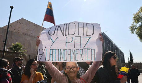 People protest with a placard reading "Unity and peace in Latin America" outside the U.S. Embassy in Mexico City, capital of Mexico, on Jan. 3, 2026. (Xinhua/Li Mengxin)