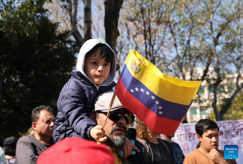 People protest outside the U.S. Embassy in Mexico City, capital of Mexico, on Jan. 3, 2026. (Xinhua/Li Mengxin)