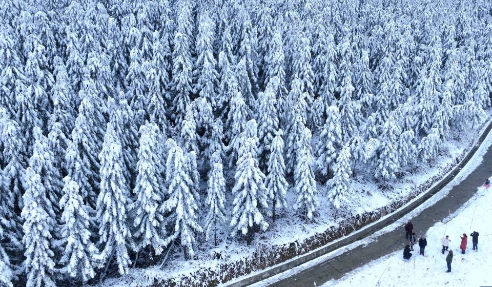 An aerial drone photo taken on Jan. 2, 2026 shows people enjoying their leisure time amid snow in Xuan'en County, central China's Hubei Province. Snowfall hit many parts of China during the New Year's Day holiday, drawing tourists to enjoy the snowy scenery. (Photo by Song Wen/Xinhua)