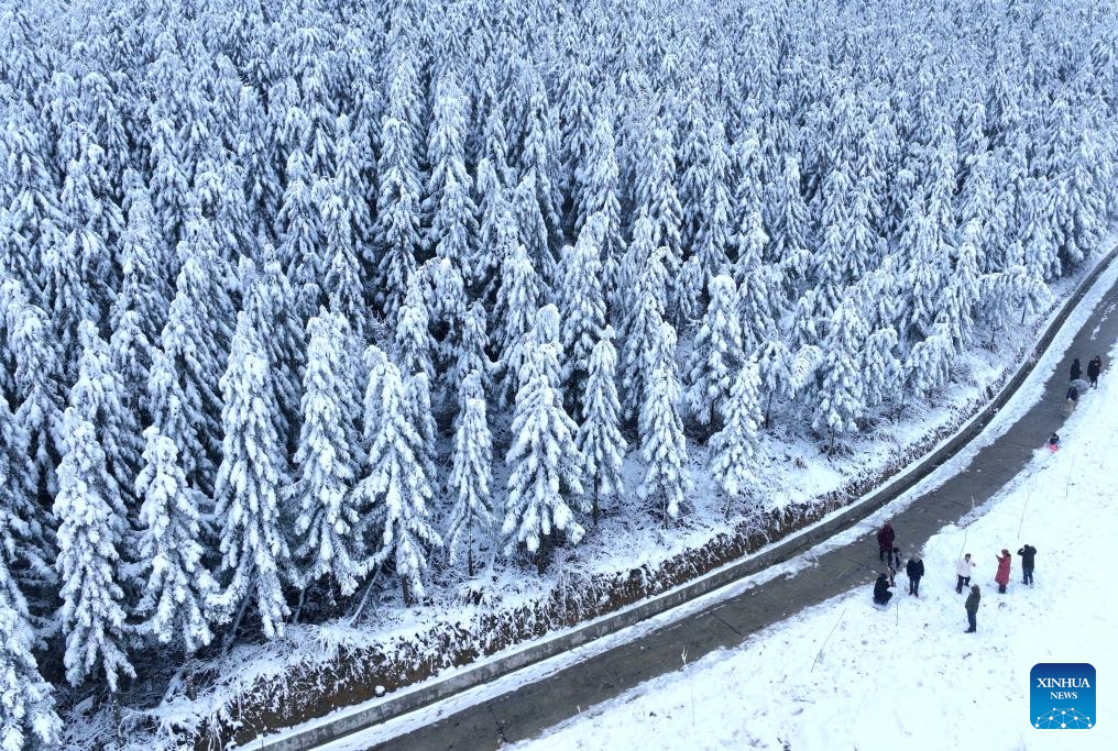 An aerial drone photo taken on Jan. 2, 2026 shows the snowy scenery in Youyang Tujia and Miao Autonomous County, southwest China's Chongqing Municipality. Snowfall hit many parts of China during the New Year's Day holiday, drawing tourists to enjoy the snowy scenery. (Photo by Qiu Hongbin/Xinhua)