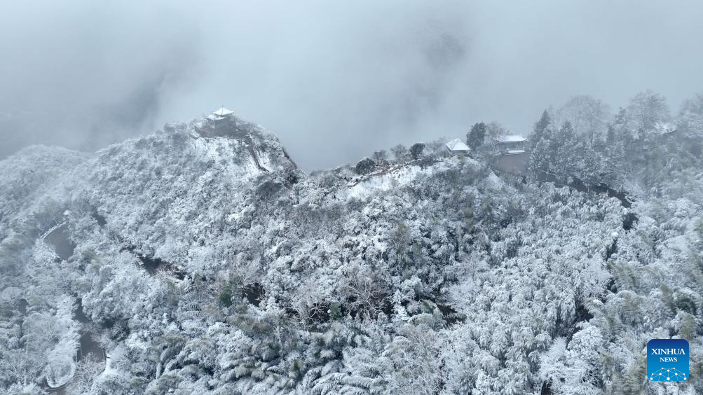 An aerial drone photo taken on Jan. 1, 2026 shows a view of the Mogan Mountain after a snowfall in Deqing County, east China's Zhejiang Province. Snowfall hit many parts of China during the New Year's Day holiday, drawing tourists to enjoy the snowy scenery. (Photo by Xie Shangguo/Xinhua)