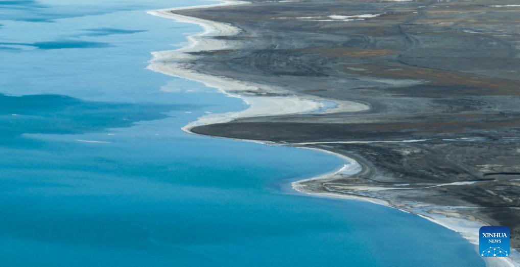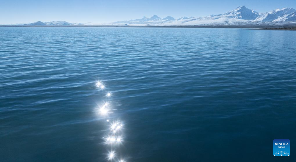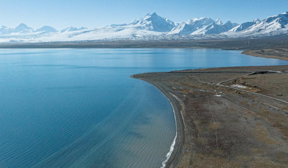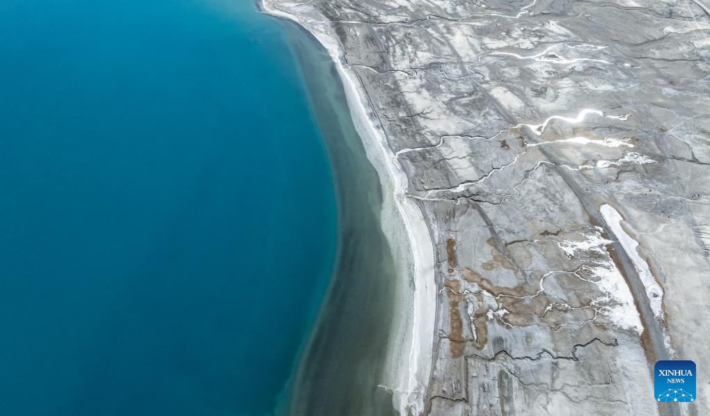An aerial drone photo taken on Jan. 3, 2026 shows the winter scenery of Baiku Co in Xigaze City, southwest China's Xizang Autonomous Region. (Xinhua/Tenzin Nyida)