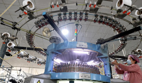 A worker operates on a blanket production line at the workshop of a company in Lianyungang, east China's Jiangsu Province, Jan. 4, 2026. (Photo by Geng Yuhe/Xinhua)