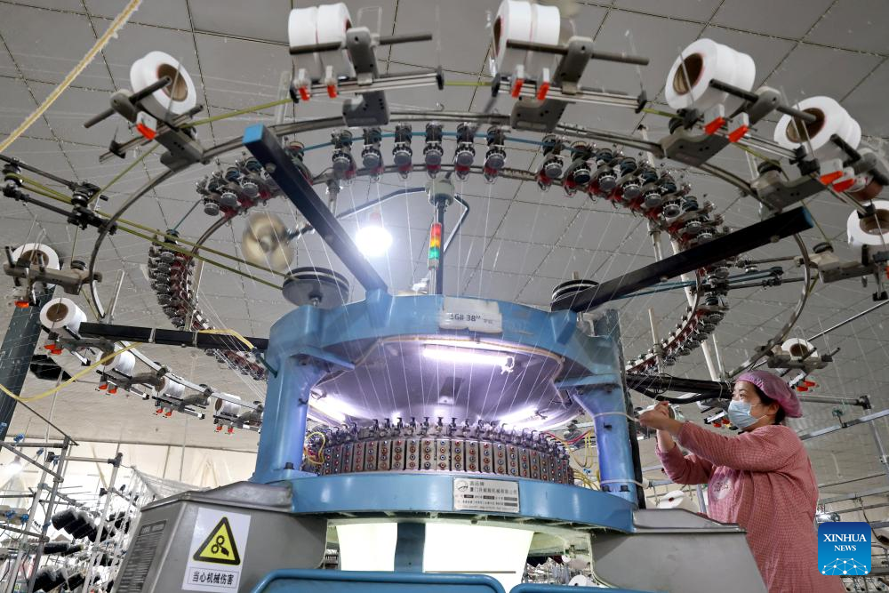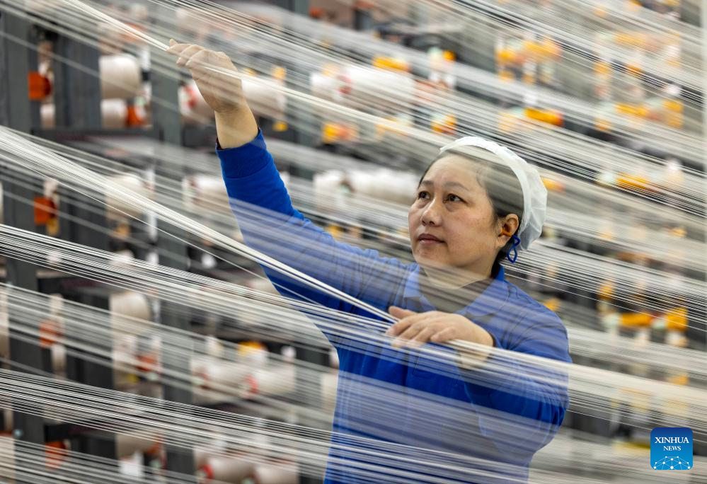 A worker operates on a textile production line of a company in Shizhong District of Zaozhuang, east China's Shandong Province, Jan. 4, 2026. (Photo by Sun Zhongzhe/Xinhua)