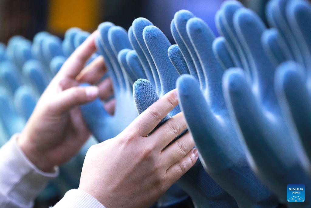 A worker operates on a production line of protective gloves at the workshop of a company in Gaomi, east China's Shandong Province, Jan. 4, 2026. (Photo by Li Haitao/Xinhua)