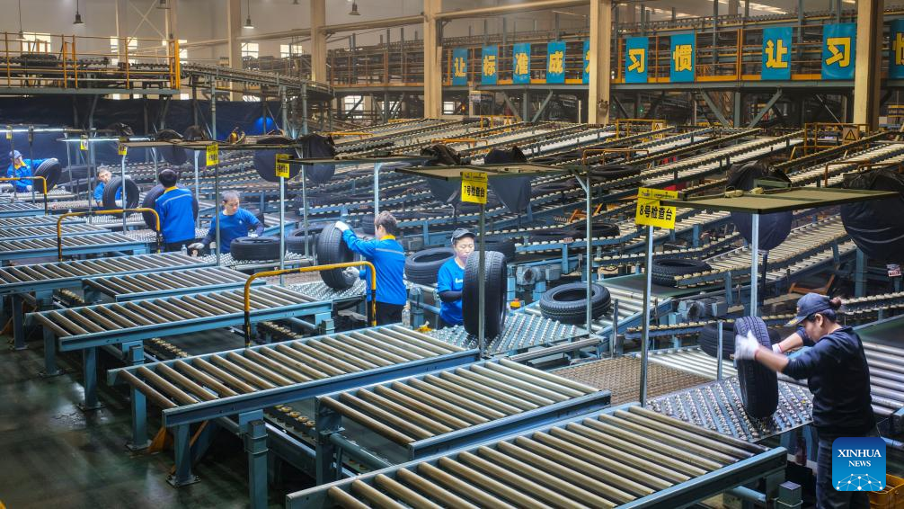 A drone photo taken on Jan. 4, 2026 shows workers checking tires at the workshop of a rubber tire company in Dongying, east China's Shandong Province. (Photo by Liu Yunjie/Xinhua)