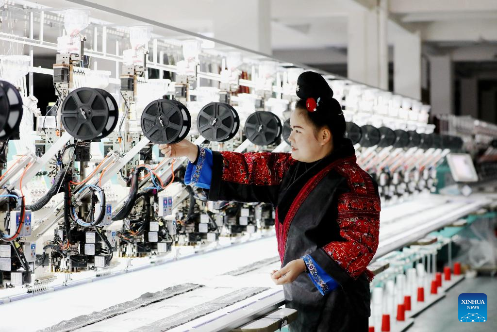 A worker operates at an intelligent Miao embroidery workshop in Shibing County of Qiandongnan Miao and Dong Autonomous Prefecture, southwest China's Guizhou Province, Jan. 4, 2026. (Photo by Tai Shengzhi/Xinhua)