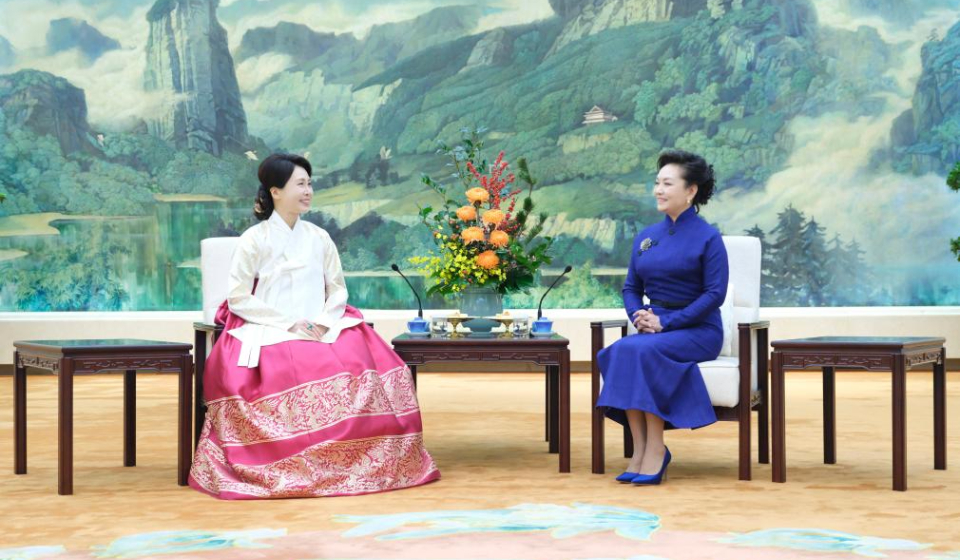 BEIJING, Jan. 5 (Xinhua) -- Peng Liyuan, wife of Chinese President Xi Jinping, chatted over tea with Kim Hea Kyung, wife of President of the Republic of Korea (ROK) Lee Jae Myung, in Beijing on Monday.