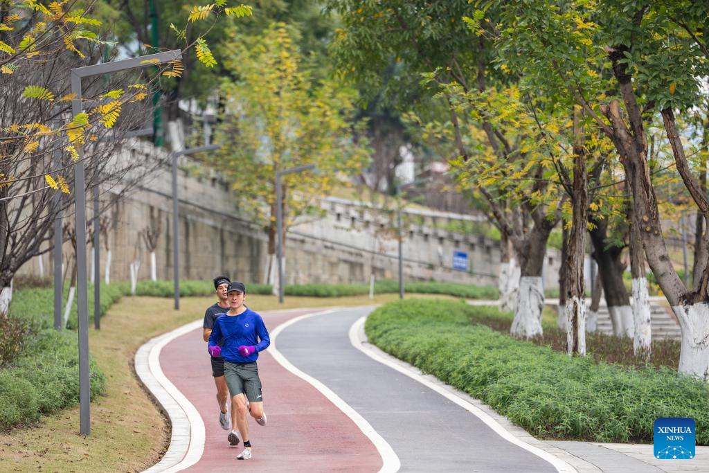 People jog at a riverbank park in Chongqing, southwest China, Jan. 7, 2026. Acting as a crucial ecological gateway for the upper reaches of the Yangtze River, Chongqing has intensified its environmental protection efforts in recent years.