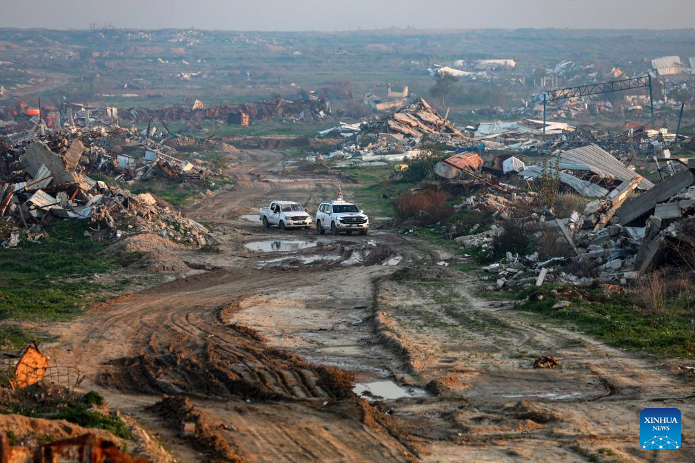 Workers from the International Committee of the Red Cross search for the remains of the last Israeli hostage east of the Zeitoun neighborhood, southeast of Gaza City, on Jan. 7, 2025. A Hamas source said Wednesday the group has resumed searching for the remains of the last Israeli hostage held in the Gaza Strip. (Photo by Rizek Abdeljawad/Xinhua)