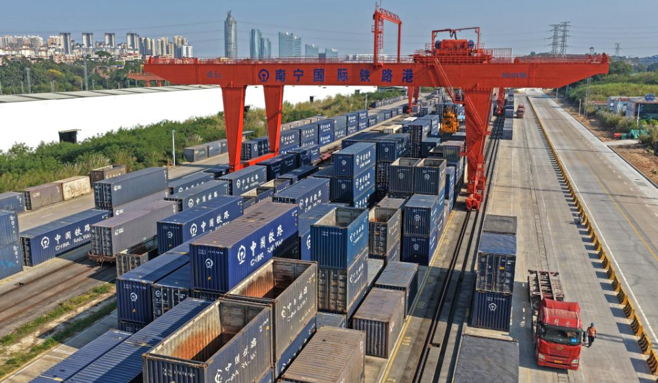A drone photo taken on Jan. 8, 2026 shows a train leaving the Nanning International Railway Port in Nanning, south China's Guangxi Zhuang Autonomous Region. China's New International Land-Sea Trade Corridor rail service handled a record 1.425 million twenty-foot equivalent units (TEUs) of cargo in 2025, marking a 47.6 percent increase and surpassing the one-million-TEU milestone for the first time, China Railway Nanning Group said on Tuesday. (Xinhua/Zhou Hua)