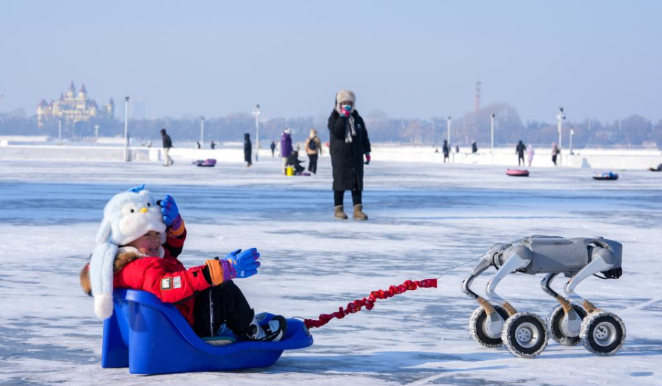 A child rides sled pulled by a robotic dog on the frozen surface of the Songhua River in Harbin, northeast China's Heilongjiang Province, Jan. 11, 2026. The surface of the Harbin section of Songhua River, now solidly frozen, serves as a "fun field," where locals and tourists alike enjoy themselves with ice-and-snow-themed amusements. (Xinhua/Wang Jianwei)