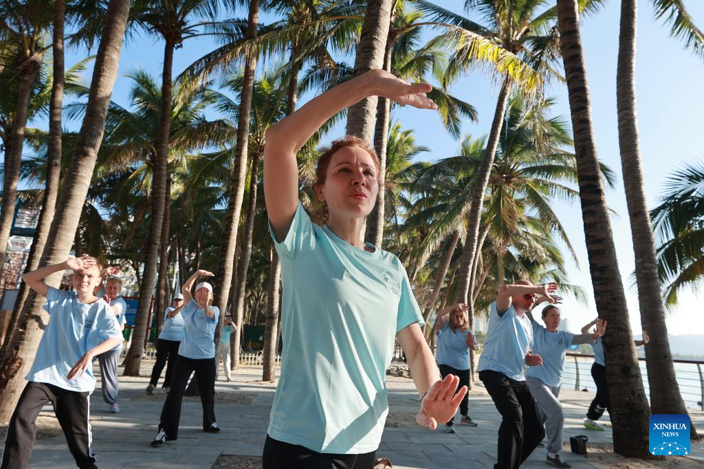 Foreign tourists learn Tai Chi under coconut groves at the Dadonghai scenic area in Sanya, south China's Hainan Province, Jan. 9, 2026. (Photo by Yuan Yongdong/Xinhua)