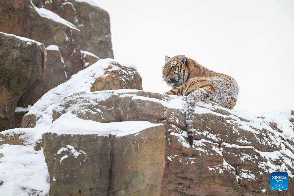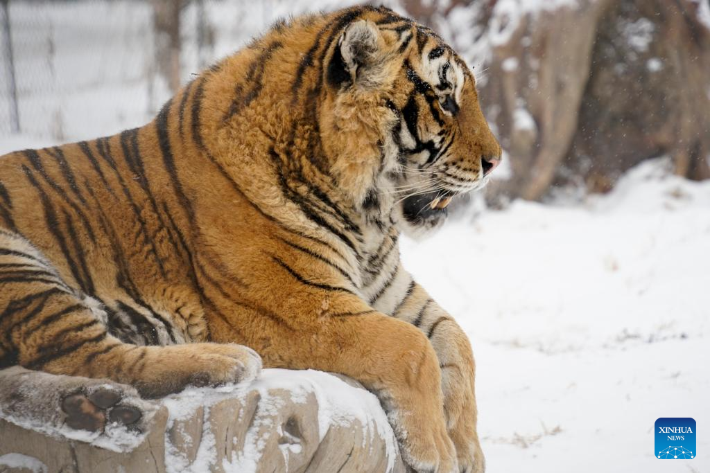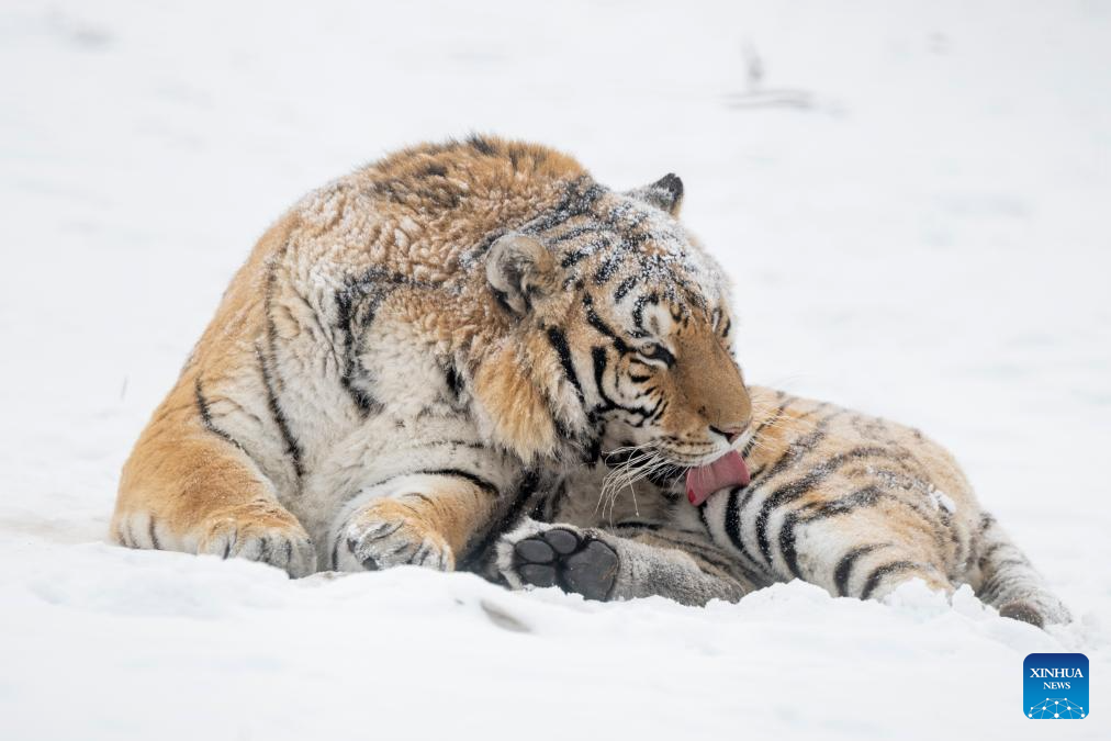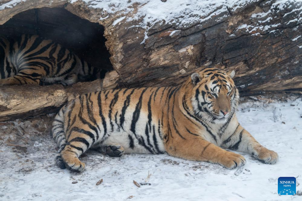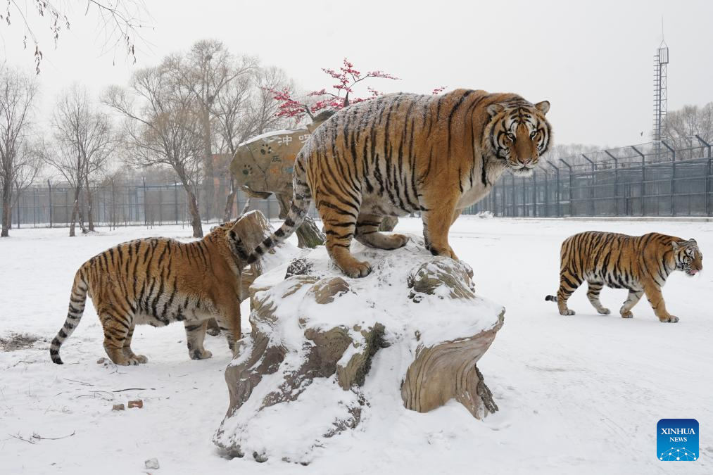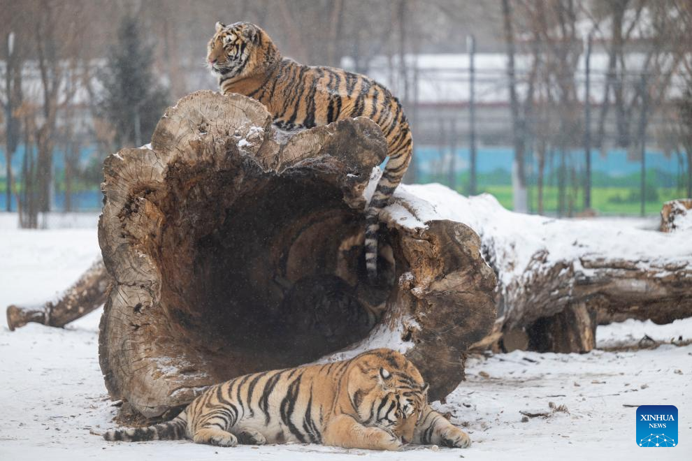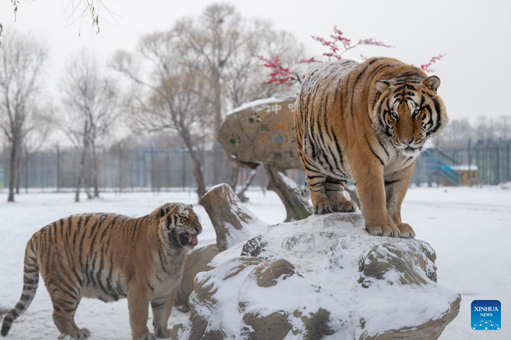 This photo taken on Jan. 12, 2026 shows tigers at the snow-covered Siberian Tiger Park in Harbin, northeast China's Heilongjiang Province. Harbin saw snowfall recently, which added a touch of winter charm to its Siberian Tiger Park. (Xinhua/Zhang Tao)