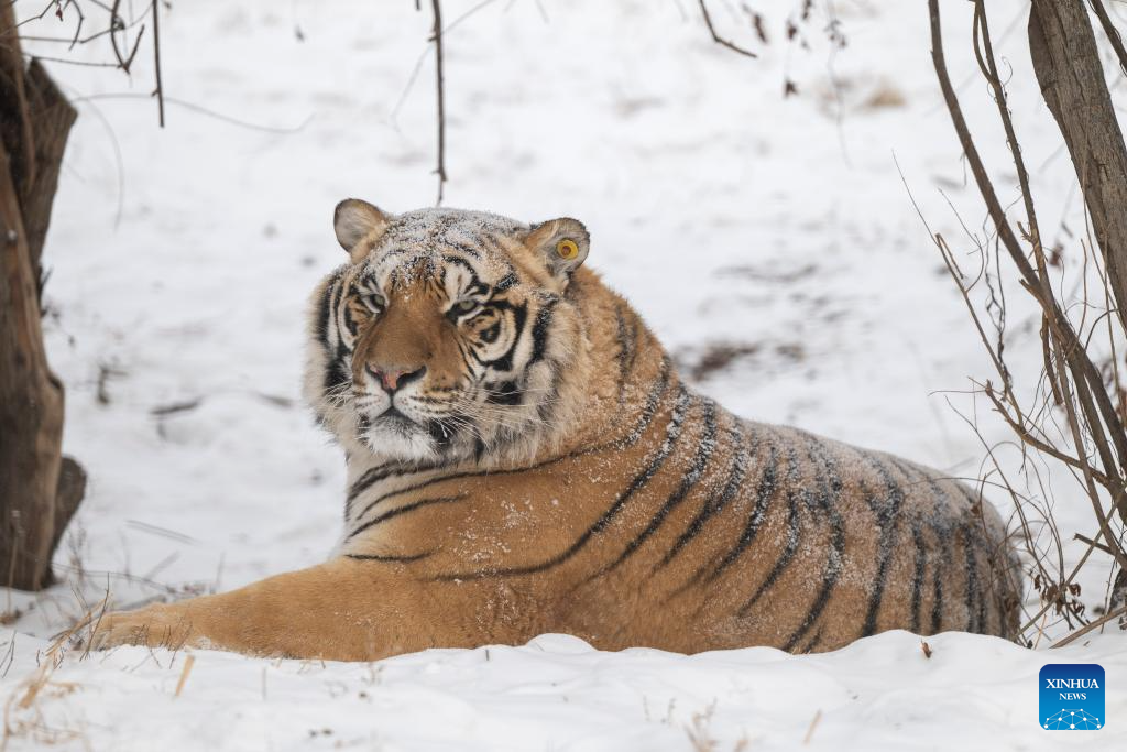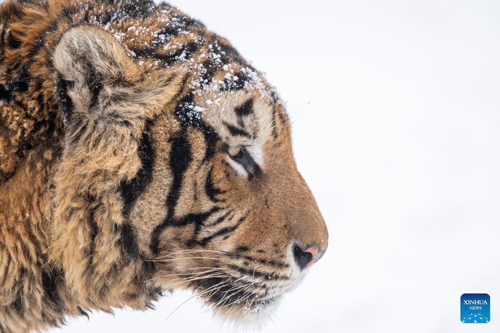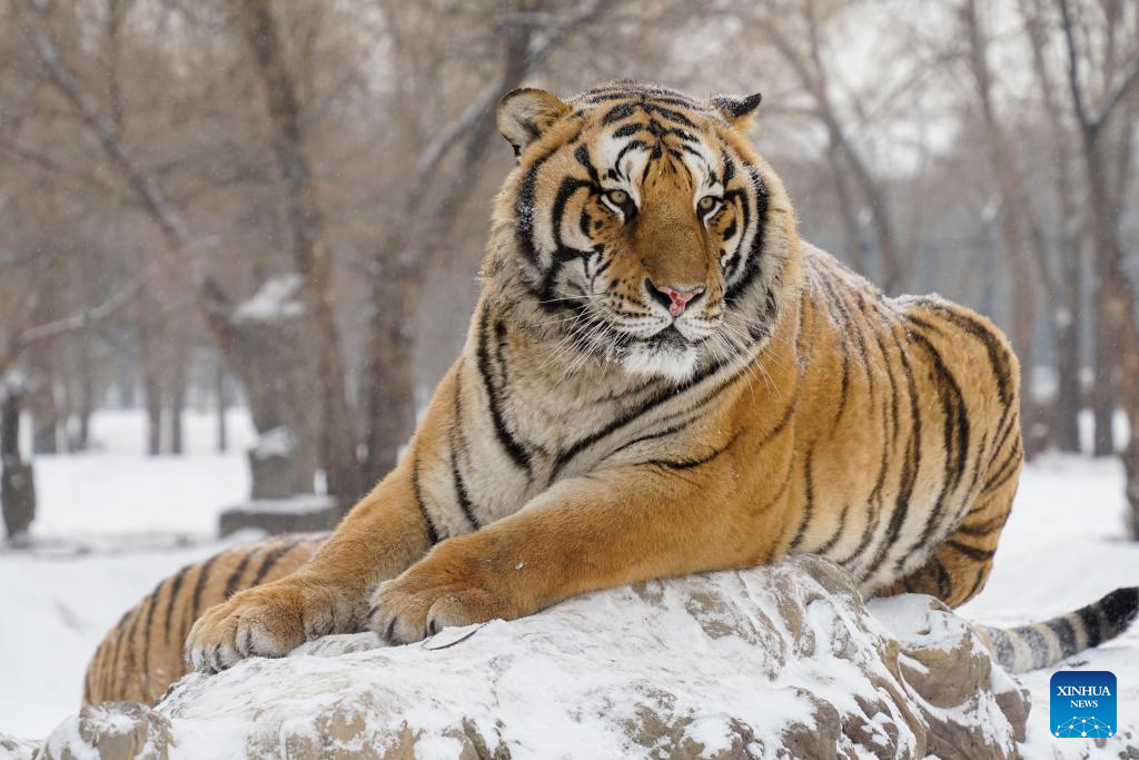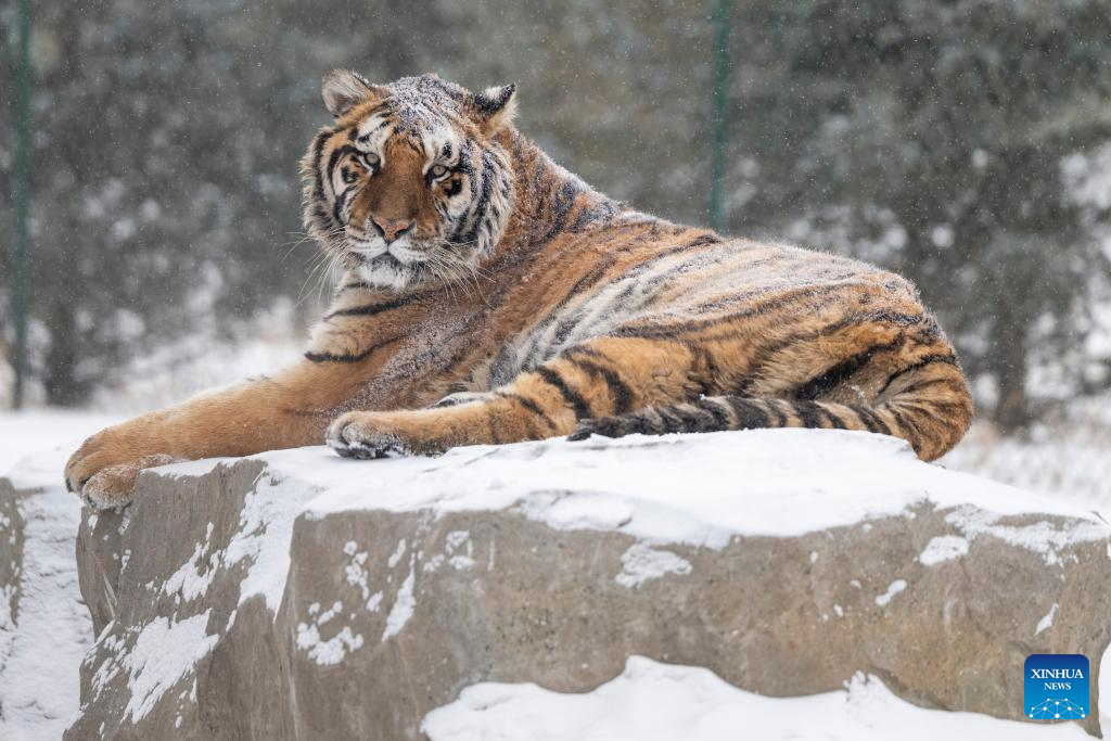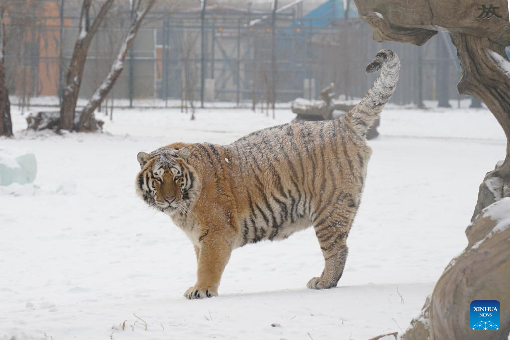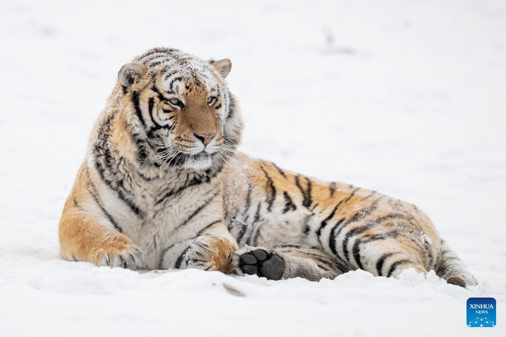 This photo taken on Jan. 12, 2026 shows a tiger at the snow-covered Siberian Tiger Park in Harbin, northeast China's Heilongjiang Province. Harbin saw snowfall recently, which added a touch of winter charm to its Siberian Tiger Park. (Xinhua/Zhang Tao)