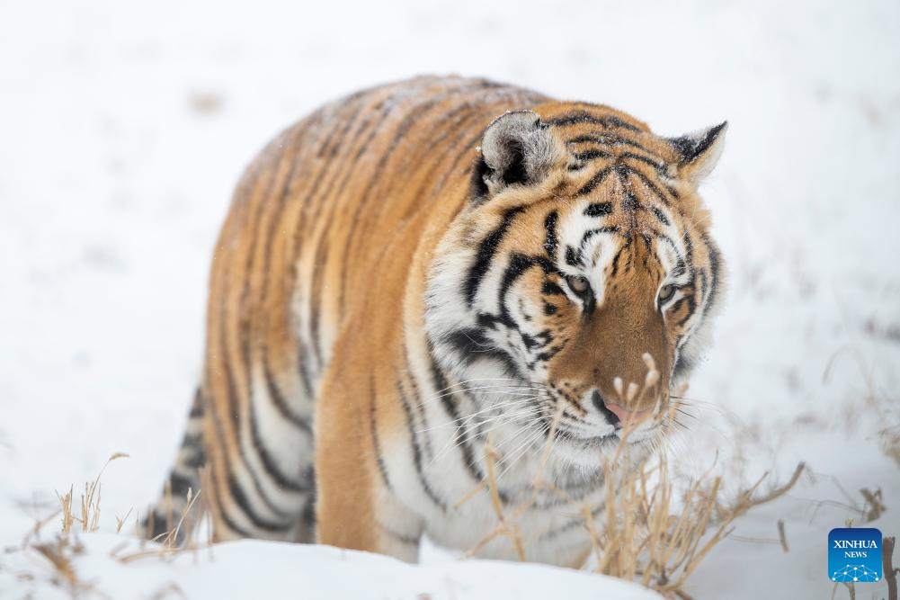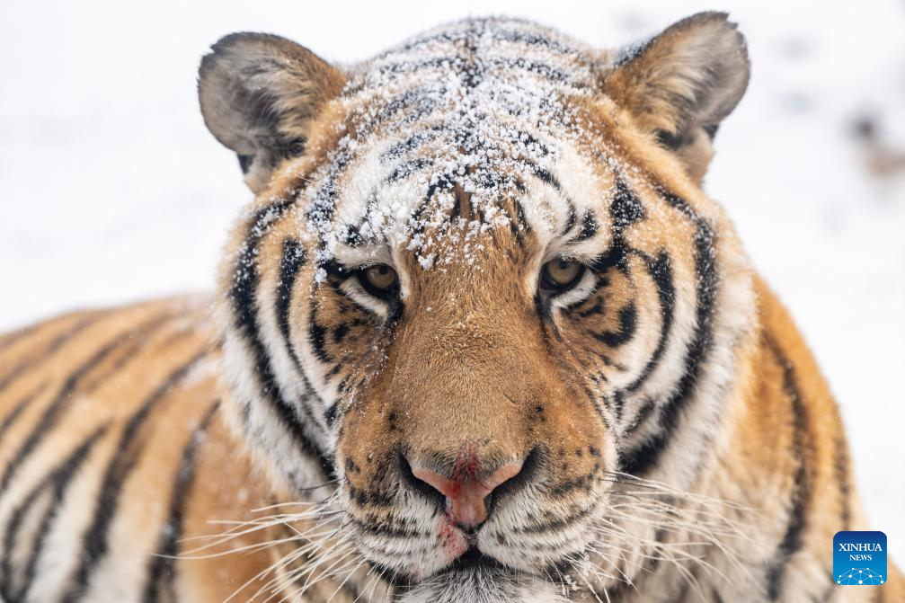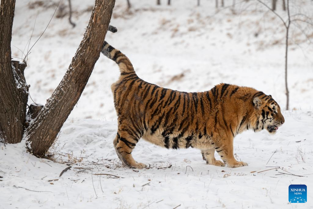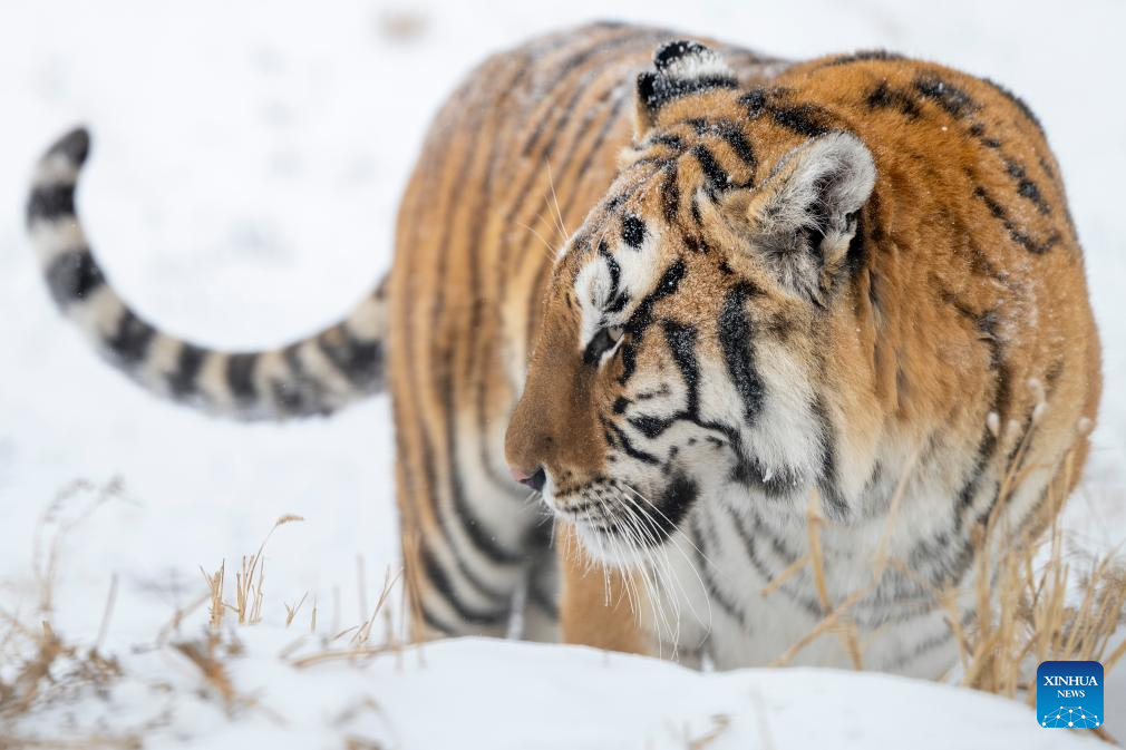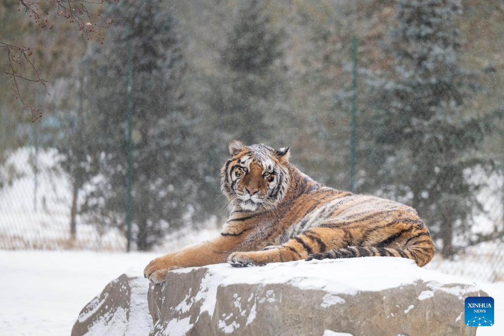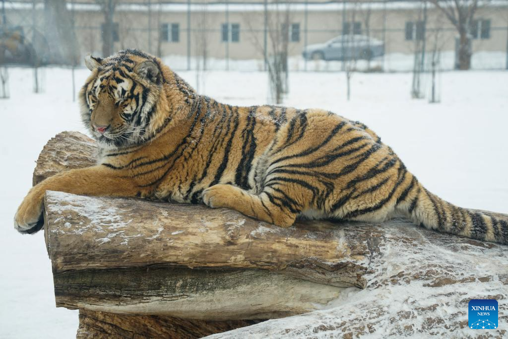 This photo taken on Jan. 12, 2026 shows a tiger at the snow-covered Siberian Tiger Park in Harbin, northeast China's Heilongjiang Province. Harbin saw snowfall recently, which added a touch of winter charm to its Siberian Tiger Park. (Xinhua/Zhang Tao)