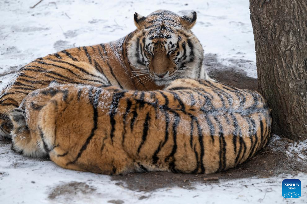 This photo taken on Jan. 12, 2026 shows tigers at the snow-covered Siberian Tiger Park in Harbin, northeast China's Heilongjiang Province. Harbin saw snowfall recently, which added a touch of winter charm to its Siberian Tiger Park. (Xinhua/Wang Zuo)