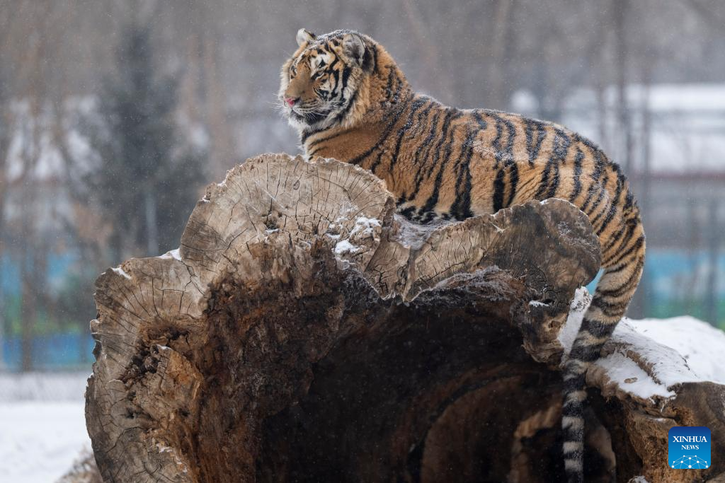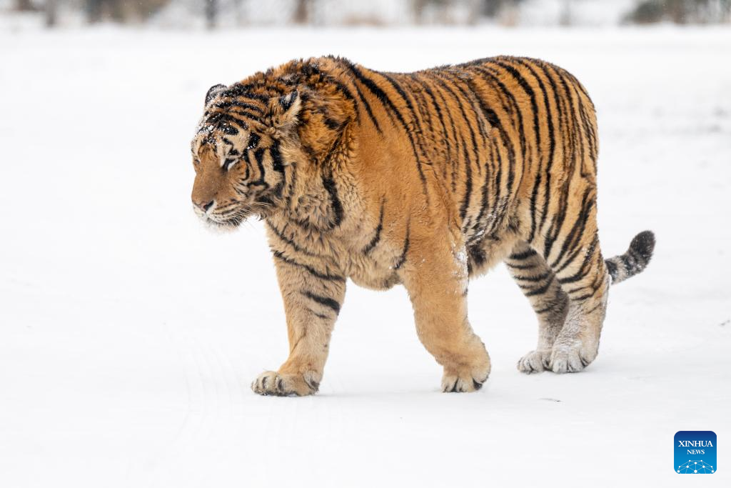 This photo taken on Jan. 12, 2026 shows a tiger at the snow-covered Siberian Tiger Park in Harbin, northeast China's Heilongjiang Province. Harbin saw snowfall recently, which added a touch of winter charm to its Siberian Tiger Park. (Xinhua/Wang Zuo)
