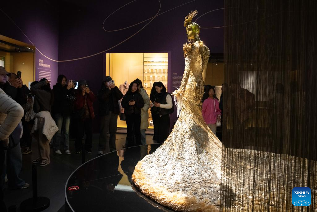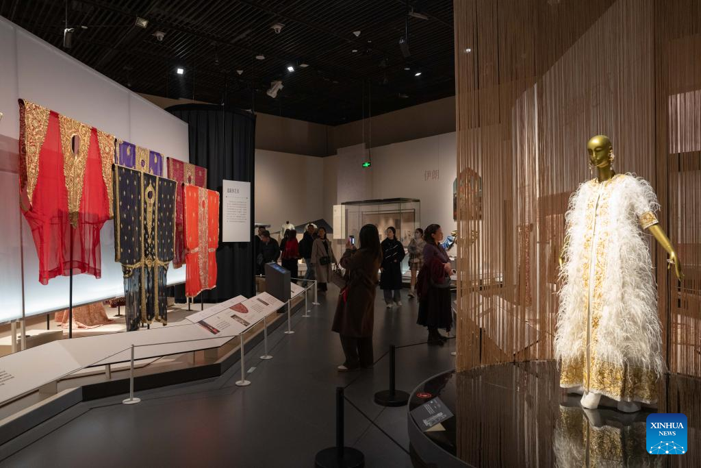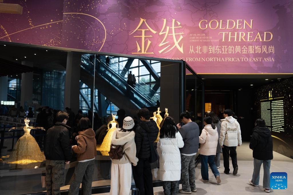People visit the exhibition "Golden Thread: the Art of Dressing from North Africa to East Asia" at the Chengdu Museum in Chengdu, southwest China's Sichuan Province, Jan. 13, 2026. The exhibition features over 200 pieces (sets) of gold-threaded textile artifacts from seven French cultural institutions, alongside precious collections from eight Chinese museums and cultural heritage organizations. (Xinhua/Xu Bingjie)