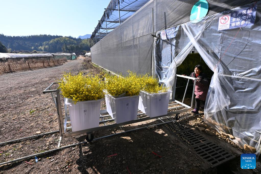 A staff member transfers oncidium at a greenhouse in Puyuan Township of Zhouning County, southeast China's Fujian Province, Jan. 15, 2026. With the approach of the Spring Festival, the market for high-altitude, cold-tolerant flowers has been steadily heating up. Inside the greenhouses of various flower enterprises, flowers in Zhouning County are blooming in full swing. Workers are busy with picking, pruning, shaping, and packaging to ensure sufficient market supply during the holiday season.