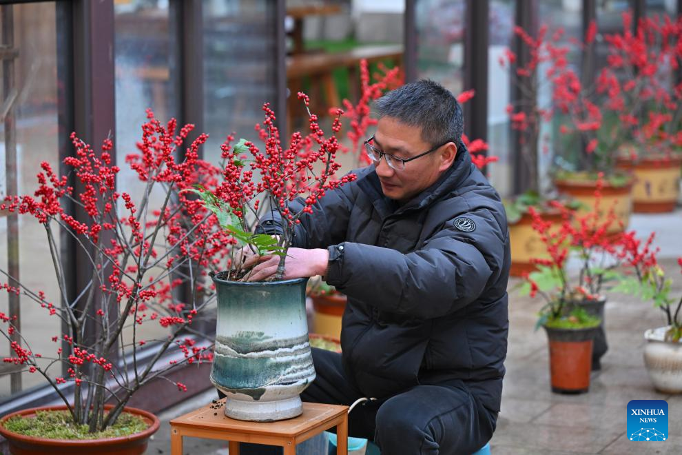 A manager arranges a holly bonsai in Puyuan Township of Zhouning County, southeast China's Fujian Province, Jan. 14, 2026. With the approach of the Spring Festival, the market for high-altitude, cold-tolerant flowers has been steadily heating up. Inside the greenhouses of various flower enterprises, flowers in Zhouning County are blooming in full swing. Workers are busy with picking, pruning, shaping, and packaging to ensure sufficient market supply during the holiday season.