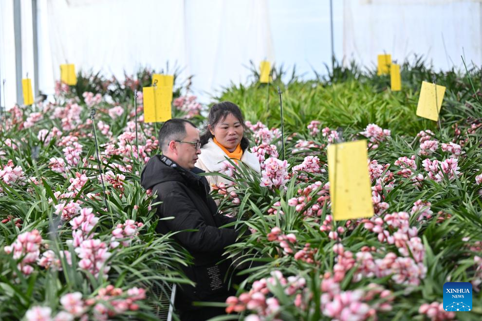 A corporate staff and a local flower industry administration official check the conditions of cymbidium hybrid orchid at a greenhouse in Puyuan Township of Zhouning County, southeast China's Fujian Province, Jan. 14, 2026. With the approach of the Spring Festival, the market for high-altitude, cold-tolerant flowers has been steadily heating up. Inside the greenhouses of various flower enterprises, flowers in Zhouning County are blooming in full swing. Workers are busy with picking, pruning, shaping, and packaging to ensure sufficient market supply during the holiday season.