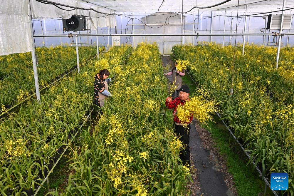 Staff members work at a cymbidium hybrid orchid greenhouse in Puyuan Township of Zhouning County, southeast China's Fujian Province, Jan. 14, 2026. With the approach of the Spring Festival, the market for high-altitude, cold-tolerant flowers has been steadily heating up. Inside the greenhouses of various flower enterprises, flowers in Zhouning County are blooming in full swing. Workers are busy with picking, pruning, shaping, and packaging to ensure sufficient market supply during the holiday season.