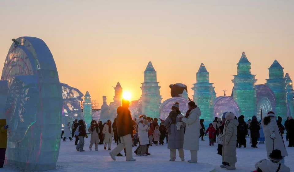 Tourists have fun at sunset at the Harbin Ice-Snow World, the world's largest ice-and-snow theme park, in Harbin, northeast China's Heilongjiang Province, Jan. 18, 2026. (Xinhua/Wang Jianwei)