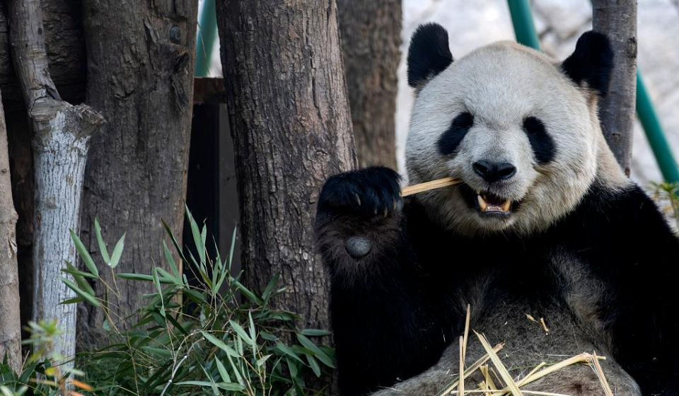 Giant panda Jingliang enjoys bamboo at the Panda World in Fuzhou, southeast China's Fujian Province on Jan. 17, 2026. Five giant pandas, arriving from Chengdu, met the public at the reopened Fuzhou Panda World on Saturday, following a 20-day adaptation period. (Xinhua/Wei Peiquan)