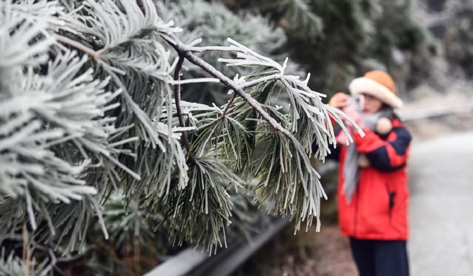 A visitor takes photos of icicles in Sanjiang Dong Autonomous County, south China's Guangxi Zhuang Autonomous Region, Jan. 21, 2026. (Xinhua/Zhang Ailin)