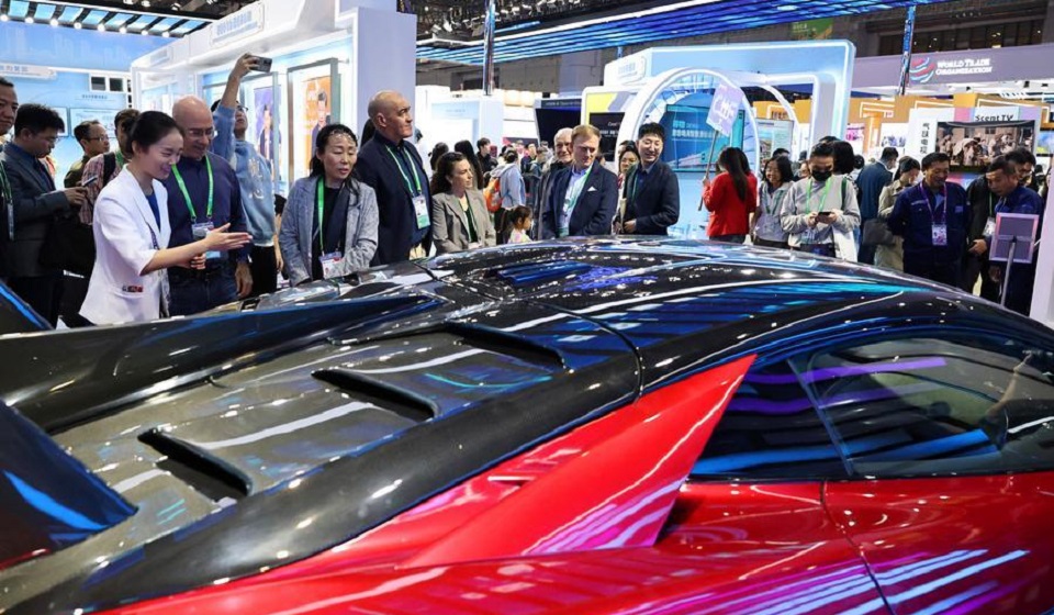 Guests view a new energy vehicle (NEV) of BYD, China's leading NEV manufacturer, at the China Pavilion during the eighth China International Import Expo (CIIE) in east China's Shanghai, Nov. 8, 2025. (Xinhua/Fang Zhe)