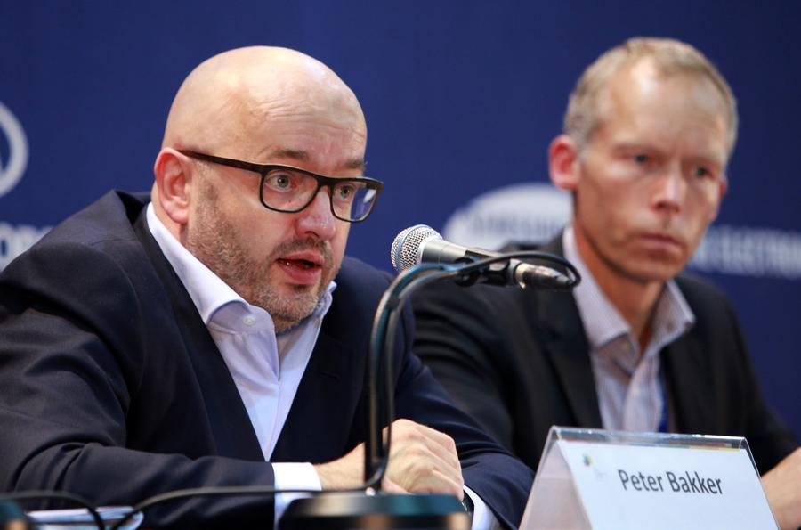 Peter Bakker (L), President of World Business Council for Sustainable Development (WBCDS), speaks during a press conference at the International Union for Conservation of Nature (IUCN) World Conservation Congress in Jeju, South Korea, on Sept. 8, 2012. (Xinhua/Park Jin-hee)