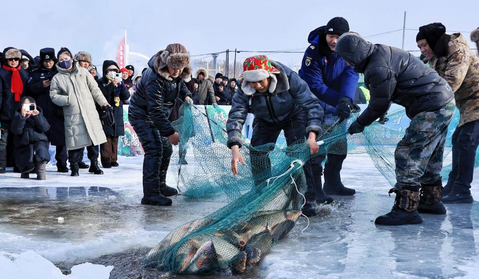 People of the Hezhe ethnic group stage a folk performance during a winter fishing festival in Jiejinkou Hezhe Ethnic Township, Tongjiang City, northeast China's Heilongjiang Province, on Jan. 23, 2026. The event, held on a frozen lake, is part of the province's winter fishing events. It integrates traditional Hezhe fishing and hunting culture with folk sports, offering visitors an immersive experience of the icy landscape and unique Hezhe customs. (Photo by Liu Wanping/Xinhua)
