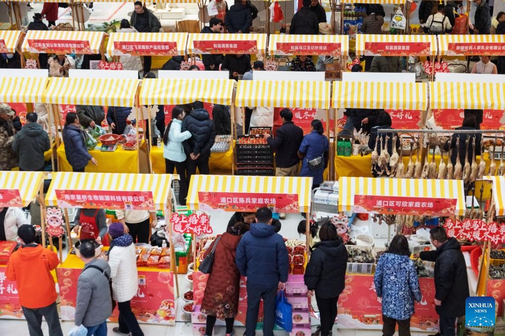 People select items for New Year celebration during a New Year fair on a square in Nanjing City, east China's Jiangsu Province, Jan. 23, 2026. Chinese people are busy preparing fresh flowers, Chinese knots, spring couplets, and other traditional necessities to celebrate the upcoming Spring Festival, or the Chinese New Year. (Photo by Sun Zhongnan/Xinhua)