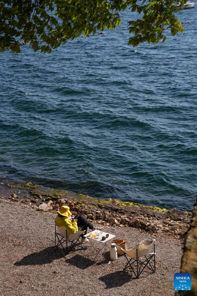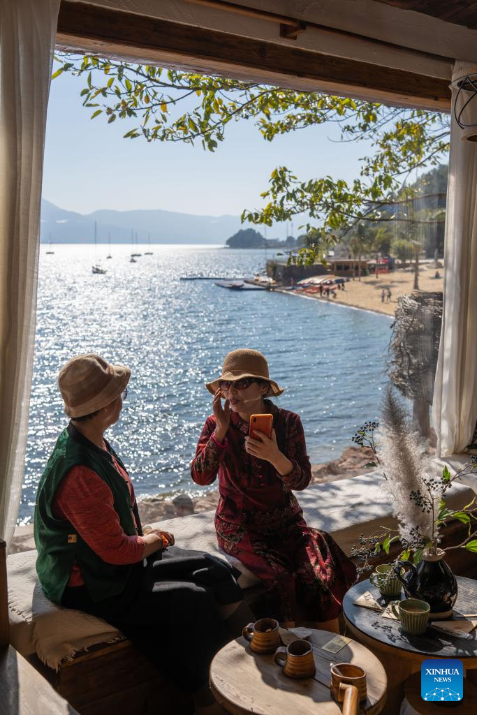 Tourists enjoy their leisure time at a cafe by the Fuxian Lake in Yuxi City, southwest China's Yunnan Province, Jan. 27, 2026. (Xinhua/Gao Yongwei)