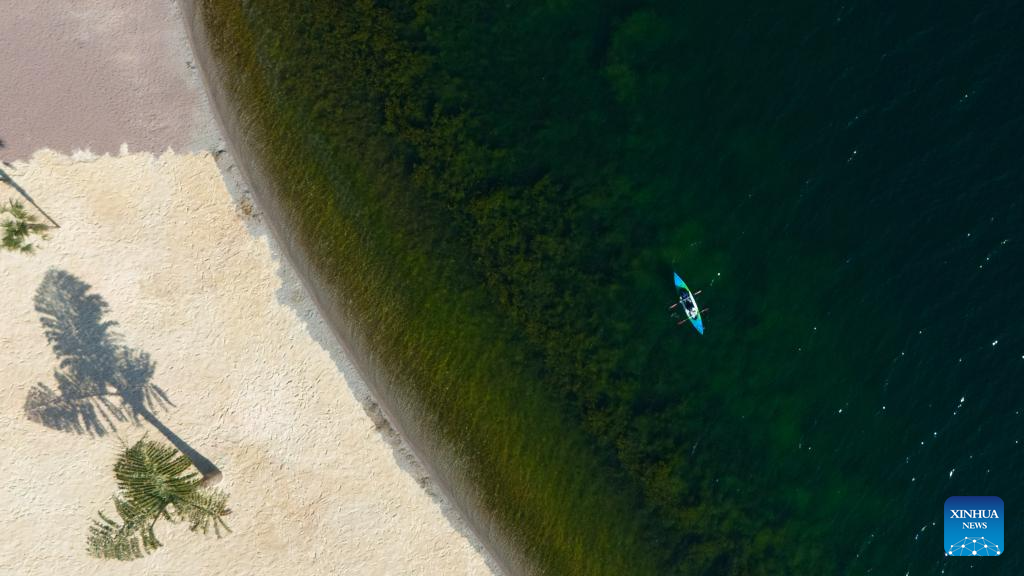 A drone photo taken on Jan. 27, 2026 shows tourists kayaking on the Fuxian Lake in Yuxi City, southwest China's Yunnan Province. (Xinhua/Gao Yongwei)
