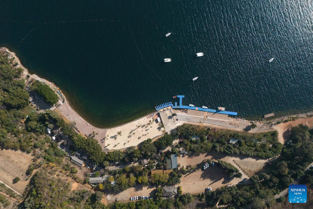An aerial drone photo taken on Jan. 27, 2026 shows yachts on the Fuxian Lake in Yuxi City, southwest China's Yunnan Province. (Xinhua/Gao Yongwei)