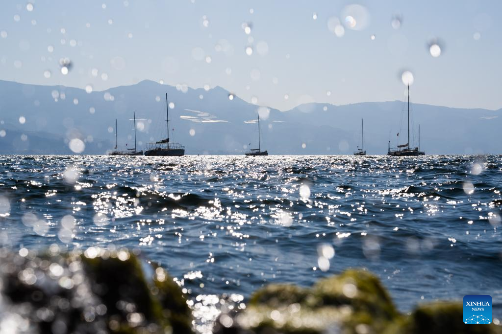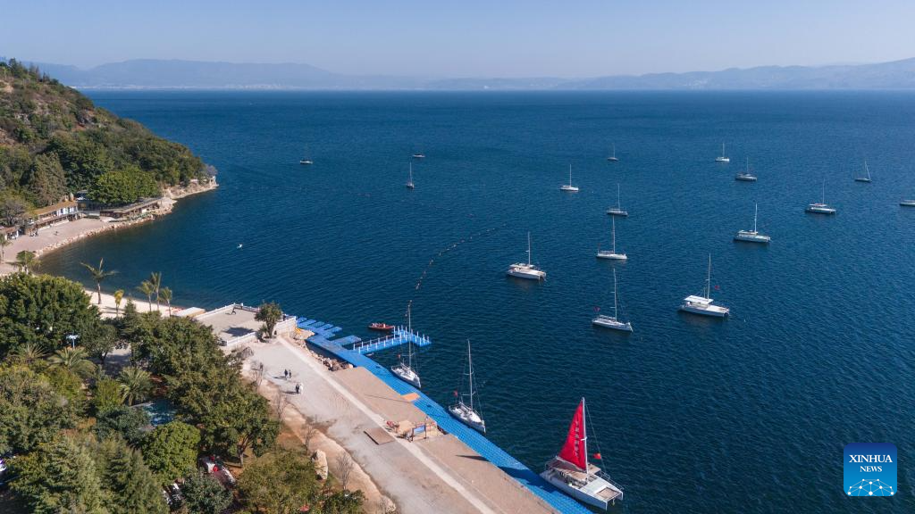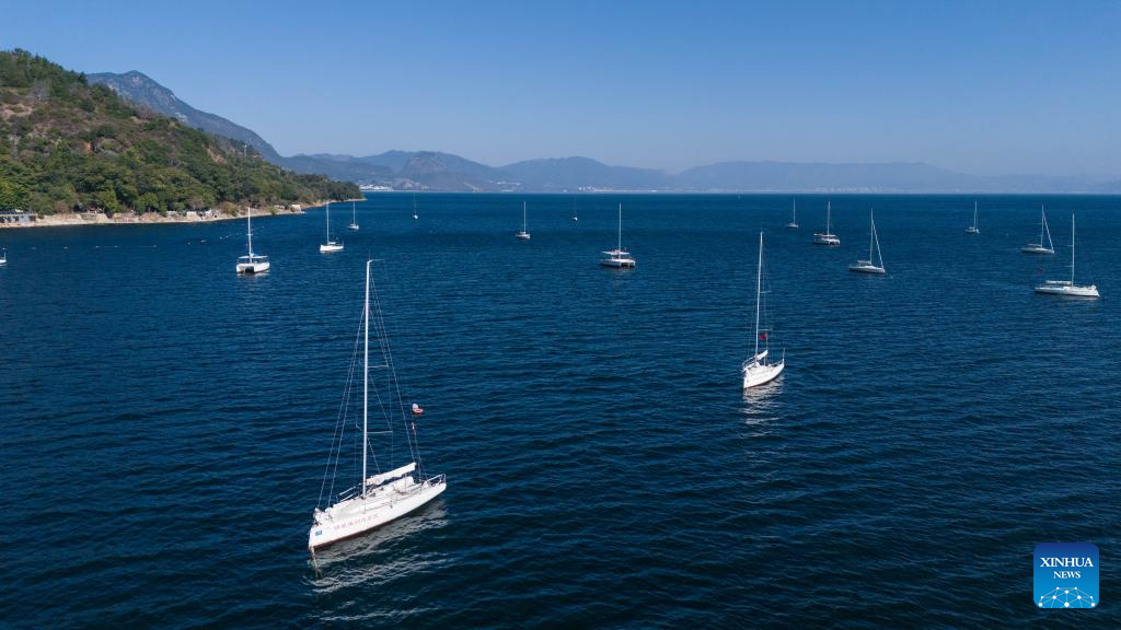 A drone photo taken on Jan. 27, 2026 shows yachts sailing on the Fuxian Lake in Yuxi City, southwest China's Yunnan Province. (Xinhua/Gao Yongwei)