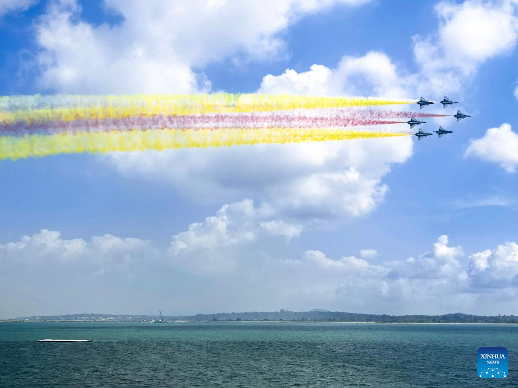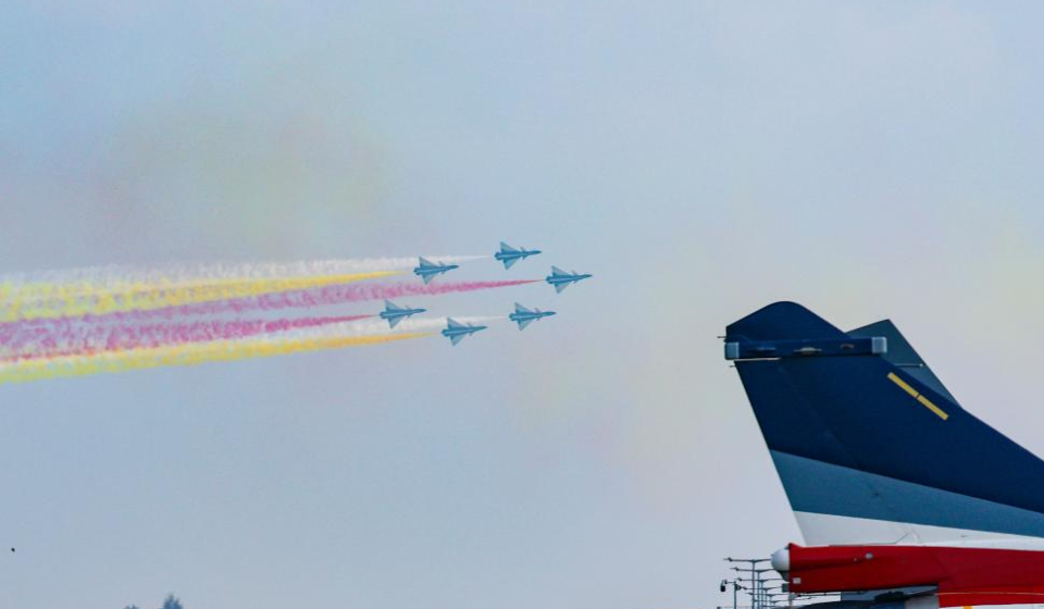 Aircraft of the Bayi Aerobatic Team of the Chinese People's Liberation Army (PLA) Air Force conduct a validation flight during the media preview for the 10th Singapore Airshow in Singapore, Feb. 1, 2026. The airshow will be held from Feb. 3 to 8 in Singapore. The appearance marks the team's return to the event since the seventh edition in February 2020. (Photo by Chen Kaize/Xinhua)