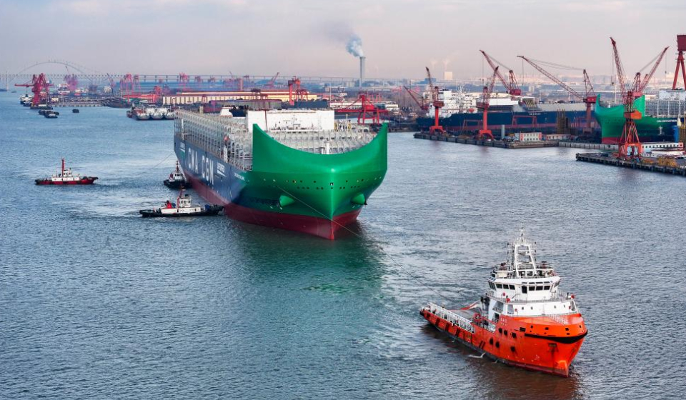 A drone photo taken on Dec. 27. 2025 shows an ultra-large container ship, independently developed and built by Yangzijiang Shipbuilding Group, being towed by tugboats along the Yangtze River in Taizhou, east China's Jiangsu Province. China's shipbuilding industry maintained the world's largest market share in terms of three major indicators for the 16th consecutive year in 2025, according to data released by the Ministry of Industry and Information Technology on Sunday.
