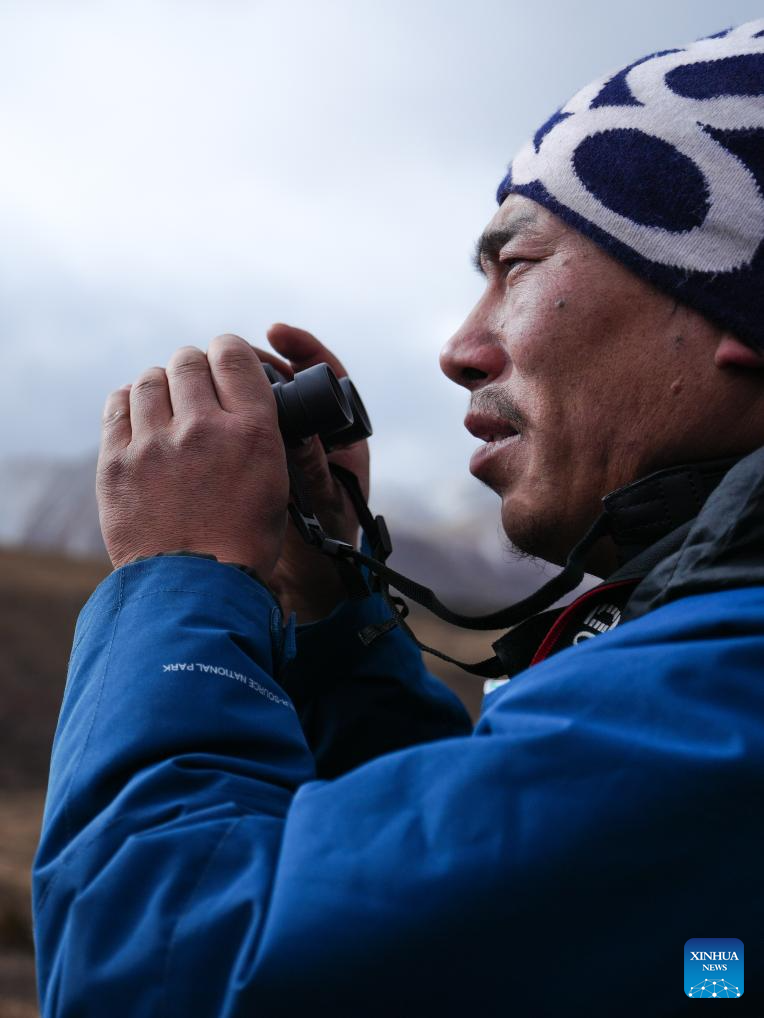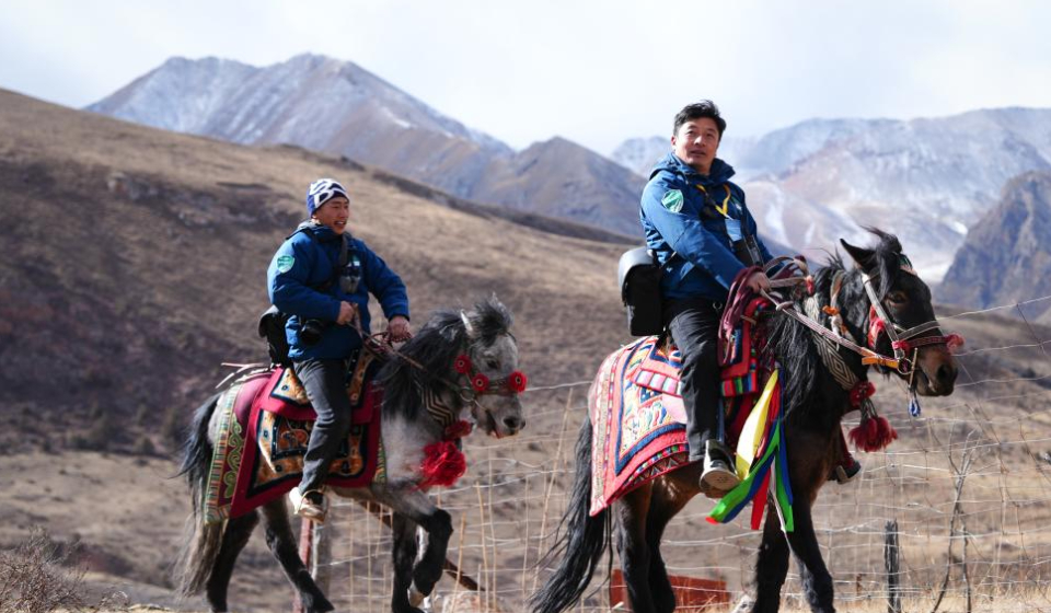 Kunga patrols in Angsai Township of Zaduo County, Yushu Tibetan Autonomous Prefecture, northwest China's Qinghai Province, Jan. 29, 2026. Amid snow-capped mountains and deep valleys in Angsai Township of Zaduo County, an area in Sanjiangyuan National Park, Tseten and Kunga trek over ridges, cross alpine meadows and carry out ecological patrols, pressing the shutter as they move through the landscape.