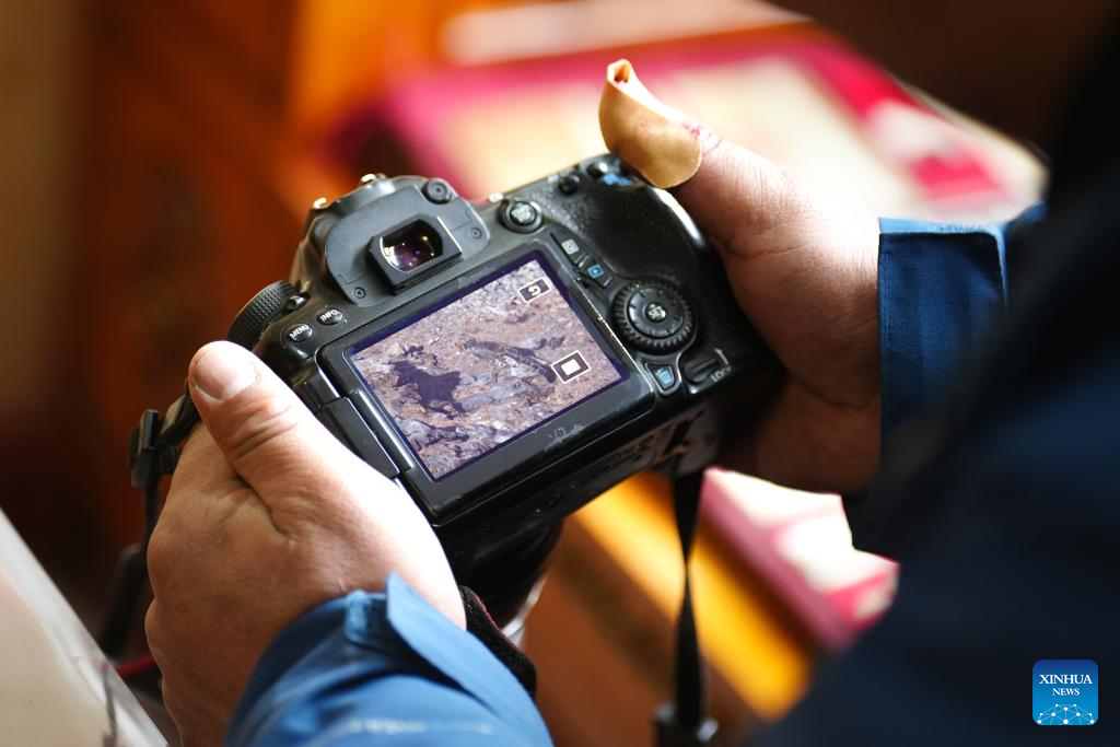 Tseten reviews a photo of a snow leopard on his camera in Angsai Township of Zaduo County, Yushu Tibetan Autonomous Prefecture, northwest China's Qinghai Province, Jan. 29, 2026. Amid snow-capped mountains and deep valleys in Angsai Township of Zaduo County, an area in Sanjiangyuan National Park, Tseten and Kunga trek over ridges, cross alpine meadows and carry out ecological patrols, pressing the shutter as they move through the landscape.