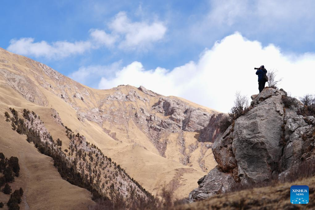 Tseten takes photos while patroling in Angsai Township of Zaduo County, Yushu Tibetan Autonomous Prefecture, northwest China's Qinghai Province, Jan. 29, 2026. Amid snow-capped mountains and deep valleys in Angsai Township of Zaduo County, an area in Sanjiangyuan National Park, Tseten and Kunga trek over ridges, cross alpine meadows and carry out ecological patrols, pressing the shutter as they move through the landscape.